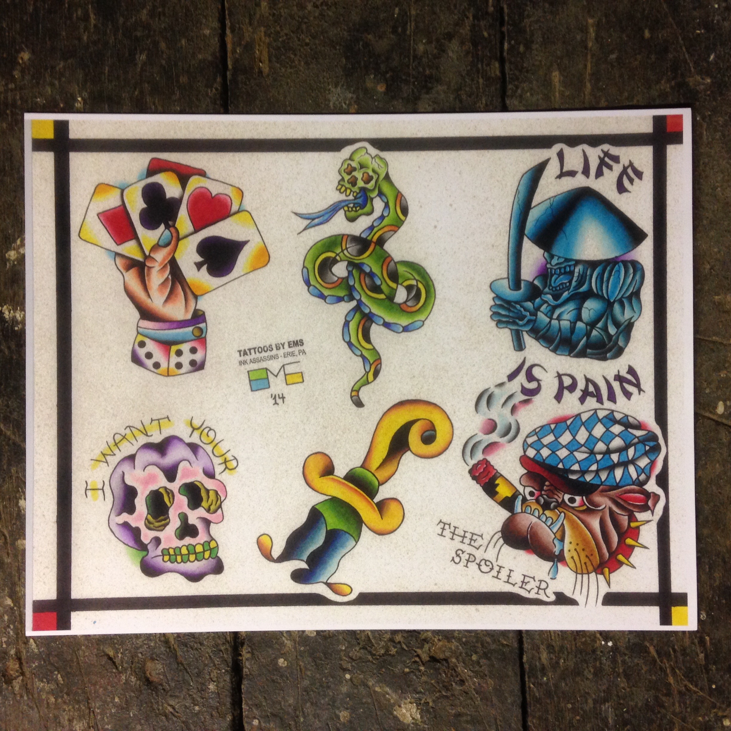 11 x 14" print on cardstock paper features numerous designs done in the traditional tattoo style. Influenced by some of my favorite bands like The Misfits, Sheer Terror, & Merauder among others.